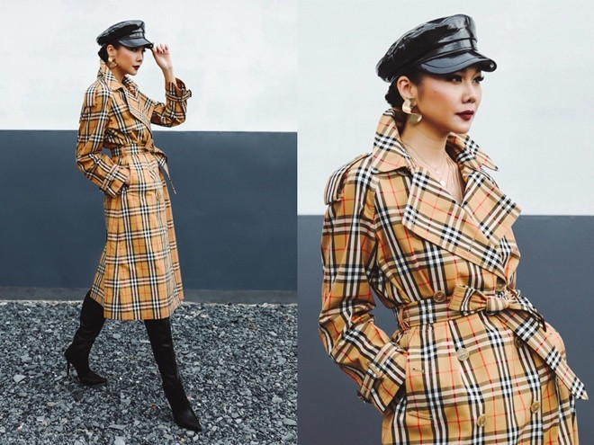 Thanh Hằng hóa quý cô điệp viên gợi cảm khi diện áo khoác cách điệu của Burberry cùng boots cao cổ và mũ baker boy của IMIS'.