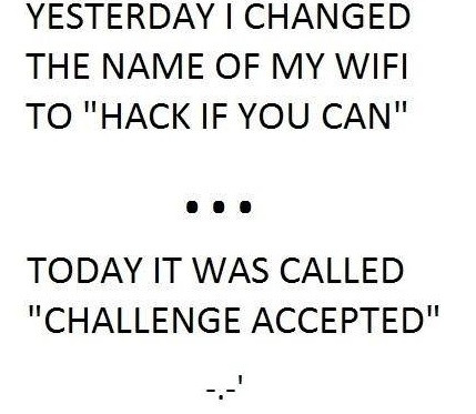 Hôm qua tôi đổi tên mạng wifi nhà mình thành “Đột nhập đi nếu có thể”. Hôm nay, có ai đó đã chuyển thành “Đổi được rồi nè!”.