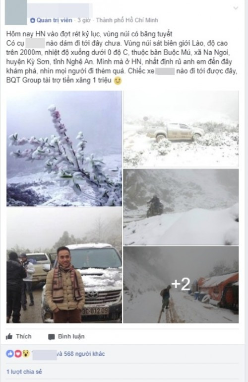 Ngày 10/1, trên mạng xã hội Facebook đăng tải những hình ảnh tuyết rơi trắng xóa ở Nghệ An. Thông tin này nhanh chóng thu hút sự chú ý của hàng nghìn người vì không ai tin, ở Nghệ An lúc này đã và đang có tuyết rơi.