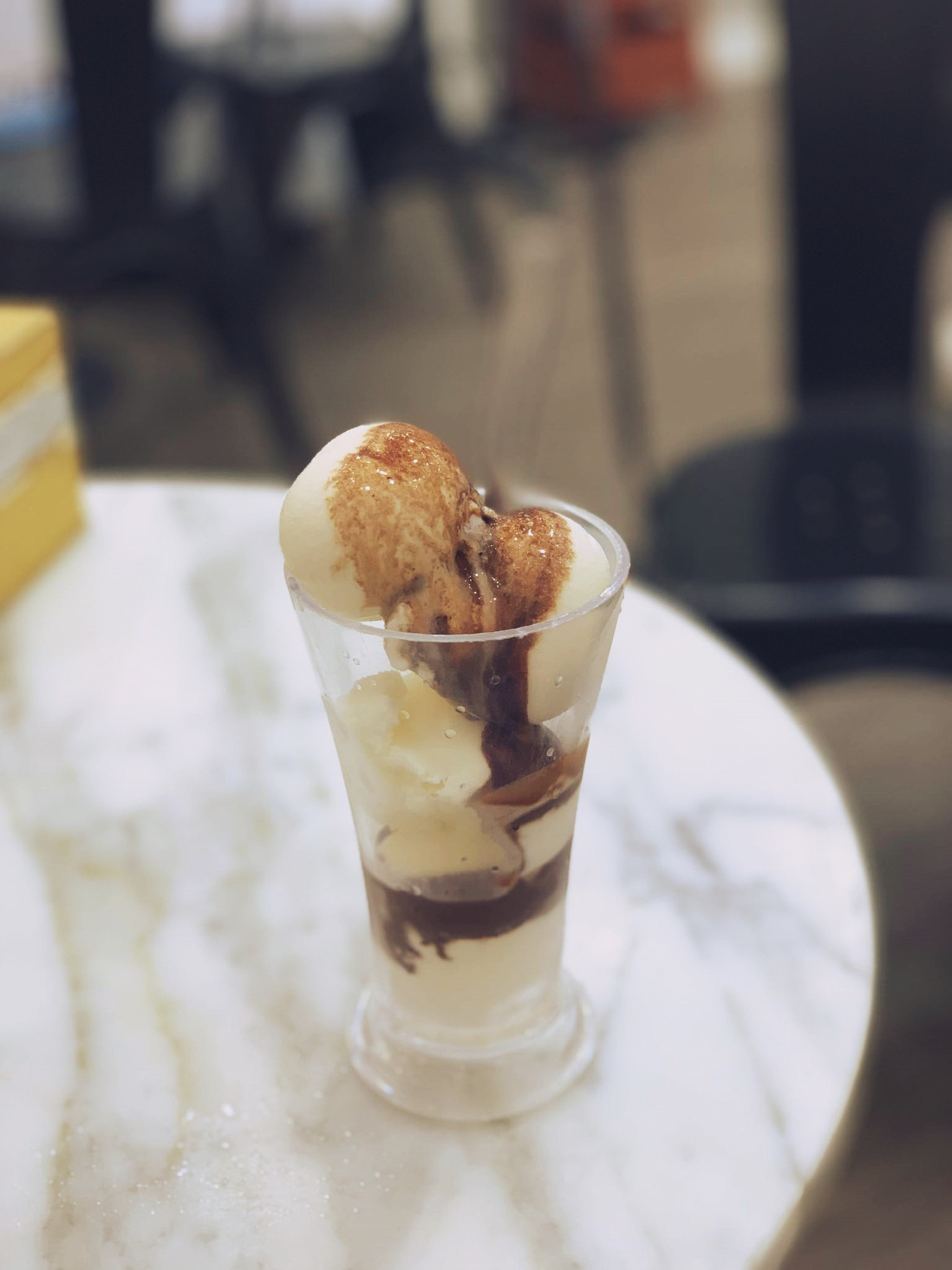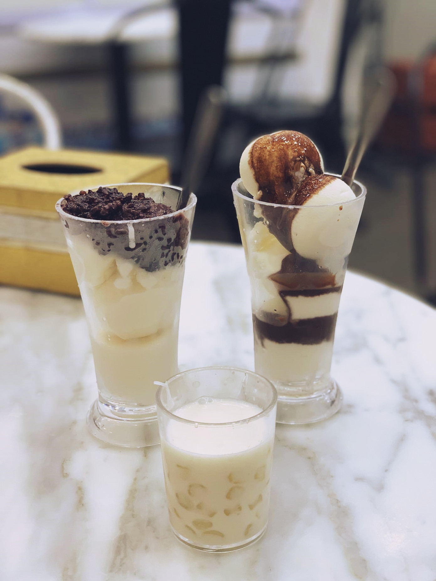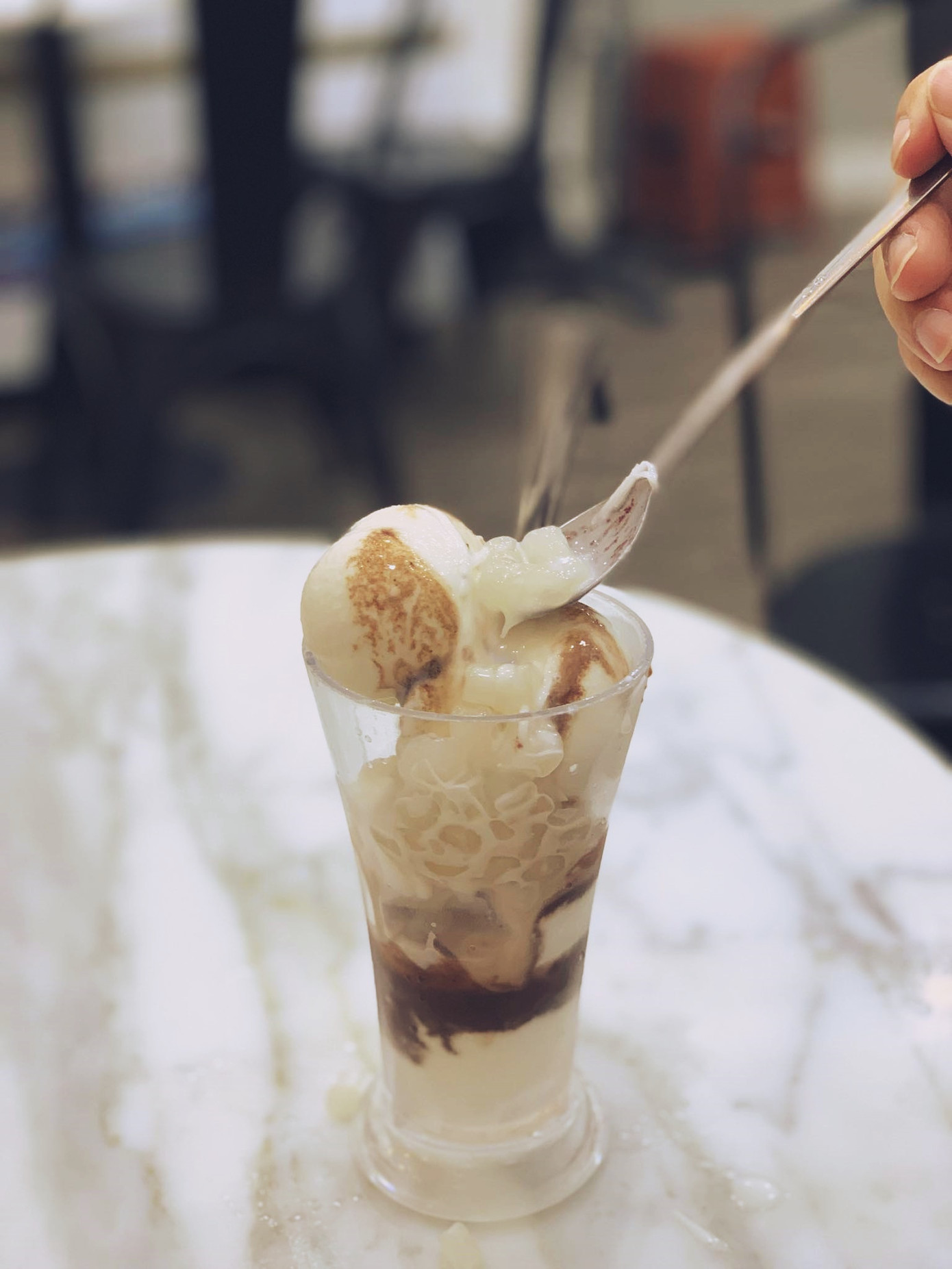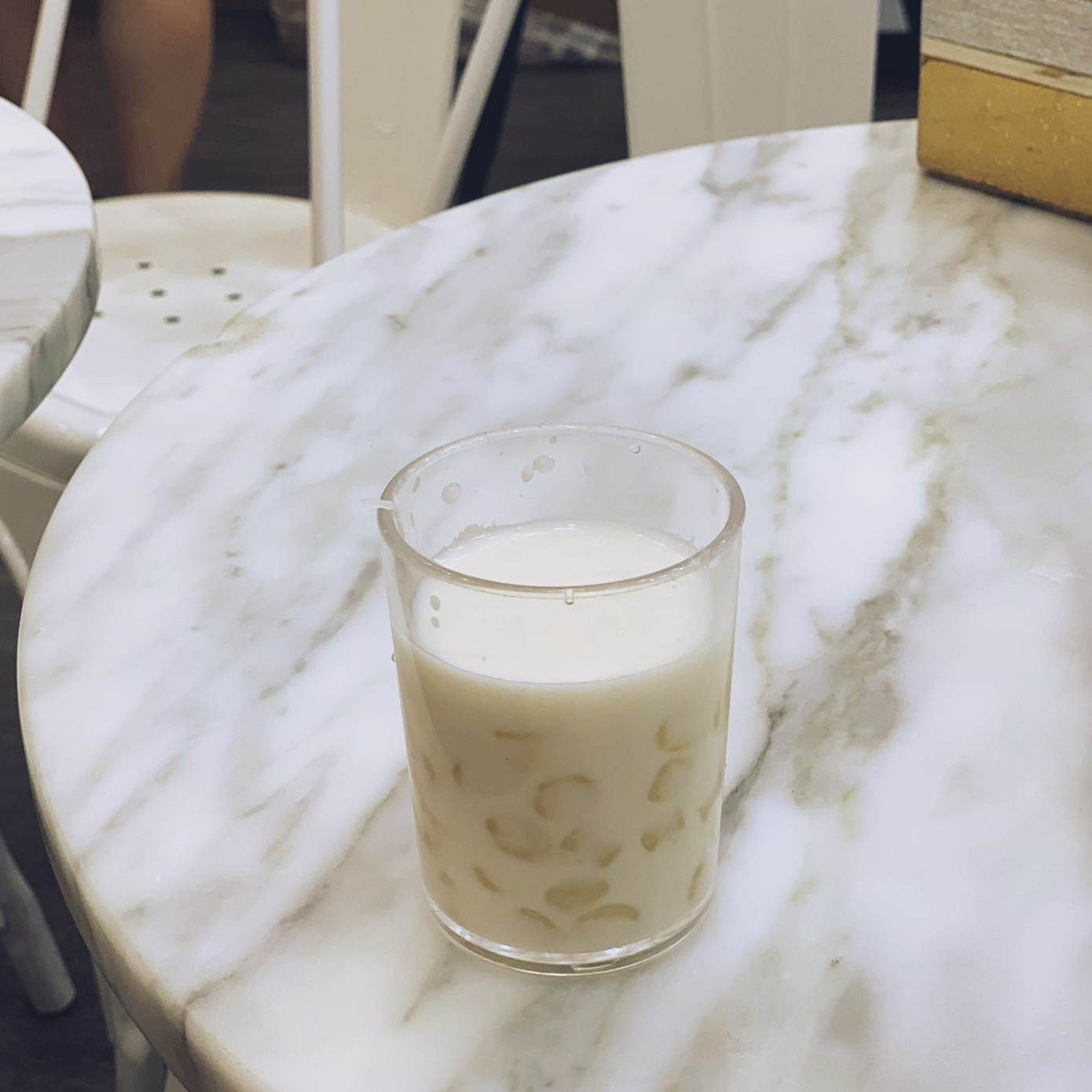 Viên trân châu ở đây là loại truyền thống dai dai và có vị bùi bùi, chứ không phải loại có nhân hay mềm mềm như trân trâu trong món trà sữa. Được đựng trong ly nước cốt dừa được đun nóng nên vị ngậy và rất thơm. Bạn có thể ăn riêng hoặc trộn cùng trân châu với sữa chua.