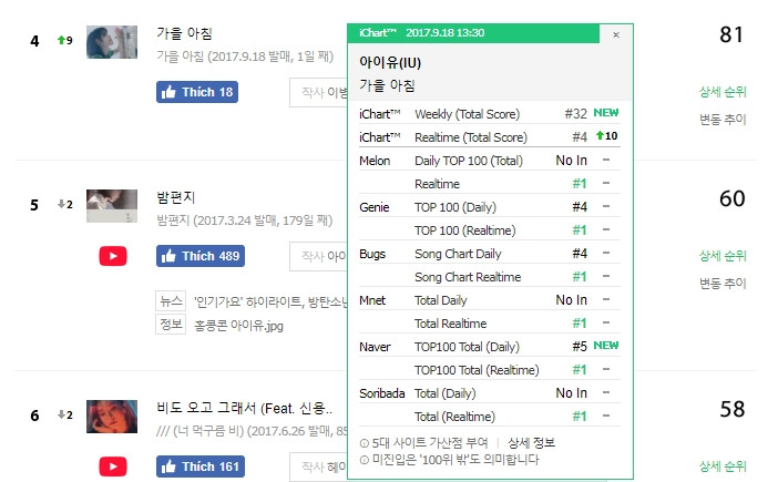 Tuy nhiên, mọi chuyện chẳng được "như ý" IU. Vào 13h khi bảng xếp hạng được cập nhật, Autumn Morning đã giành All-Kill Realtime trên iChart. Trên Melon, ca khúc cũng đã ghi nhận gần 400.000 lượt người nghe. Cùng với đó, ca khúc Through the Night được ra mắt từ tháng 3 vẫn bám trụ kiên cường tại TOP 5 iChart. IU quả đúng là "thánh nhạc số" bất khả chiến bại.