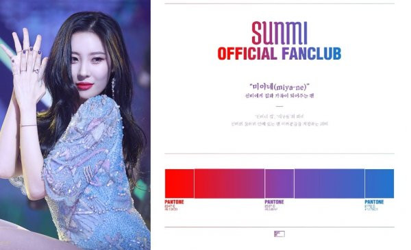 Mới đây, Sunmi đã thông báo màu sắc đại diện chính thức cho fandom của mình. Sunmi đi hát đã lâu rồi, bây giờ mới chọn được màu đại diện đã là muộn so với nhiều idol. Màu sắc mà cô công bố đến khán giả là một tông màu được pha trộn giữa màu xanh lam, tím và hồng đậm.