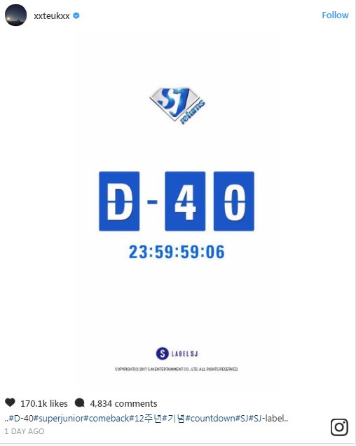 Mới đây, trang web chính thức của Super Junior đã đăng tải hình đồng hồ đếm ngược, để các fan biết còn bao nhiêu ngày tới thời điểm nhóm comeback. Ngay sau đó, tài khoản Instagram của trưởng nhóm Lee Teuk cũng đăng tải lại hình ảnh này, kèm theo rất nhiều hashtag ý nghĩa như #D-40 #superjunior #comeback #12thanniversary #SJ, #SJ-label…