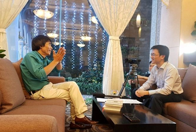 Nhà báo Nguyễn Tuấn Anh trong một cuộc phỏng vấn TS Lê Thẩm Dương. Ảnh: Nguyễn Tiến Dũng.