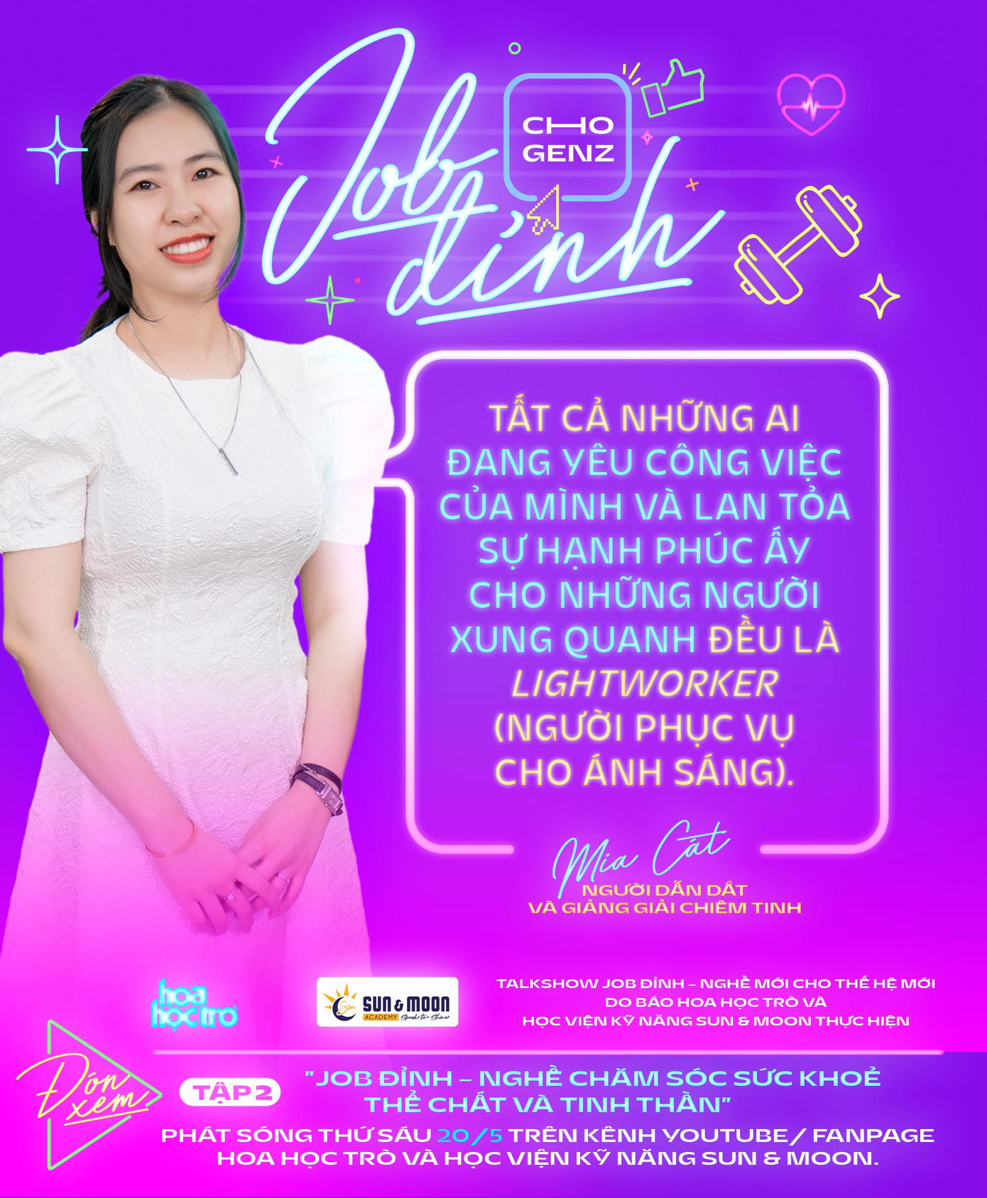 Để khám phá toàn bộ các “ngóc ngách” các ngành nghề Health Care, đừng bỏ lỡ Tập 2 của talkshow Job Đỉnh - Nghề mới cho thế hệ mới do báo Hoa Học Trò và Học viện kỹ năng và ngôn ngữ Sun & Moon phối hợp thực hiện. Cùng host Thanh Thảo trò chuyện với 3 vị khách mời: Health Coach Trần Lan Hương, Huấn luyện sức khỏe fitness Sky Coach, Người dẫn dắt và giảng giải Chiêm tinh Mia Cát nào!