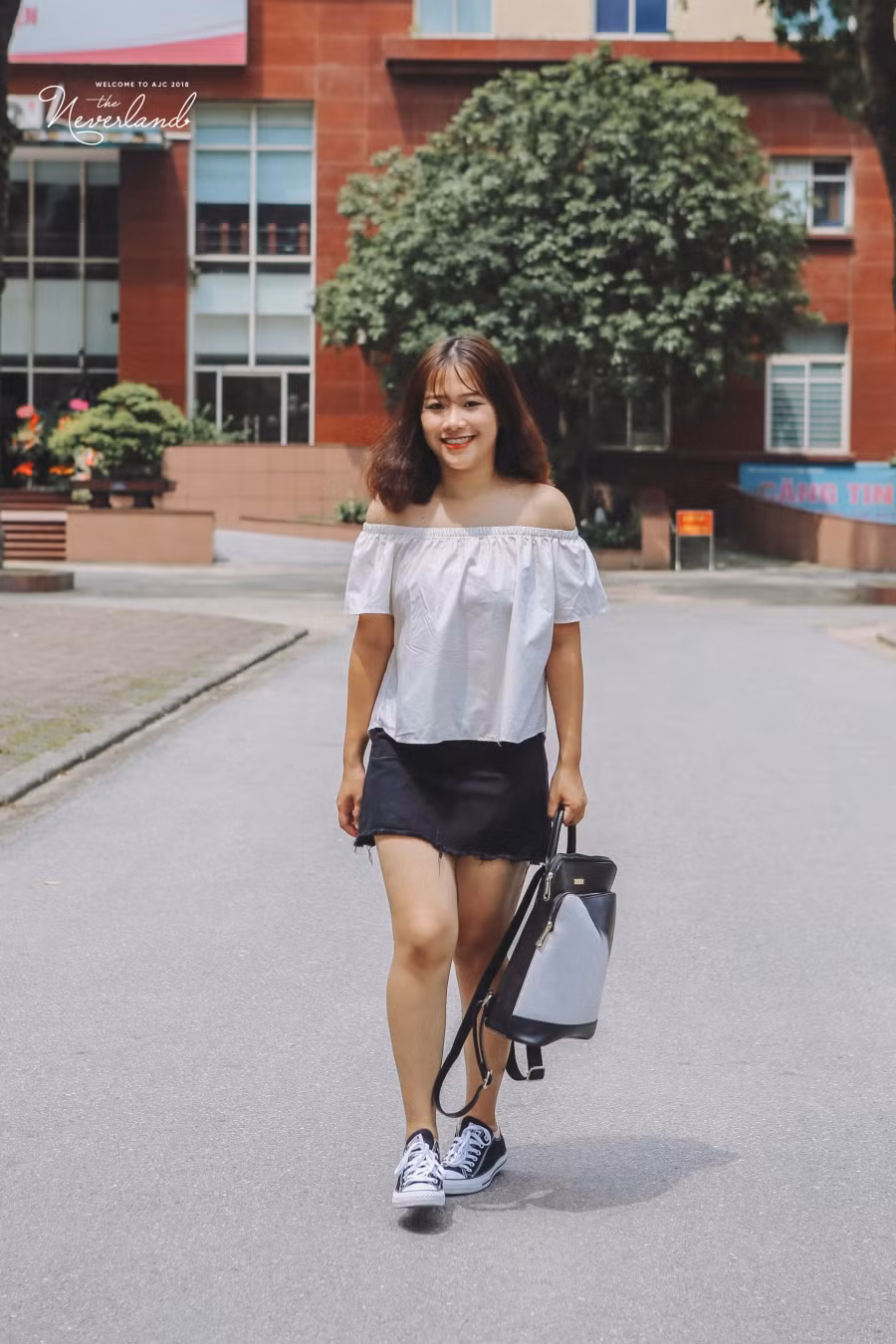 “Mình kết hợp áo trễ vai với chân váy đều do tự tay mẹ mình may. Mình rất muốn khoe cho mọi người món quà đặc biệt này và gây ấn tượng tốt với các bạn trong ngày đầu tiên đi học” - bạn Lê Hoài Anh - Kinh tế và quản lý CLC K38 hào hứng chia sẻ.