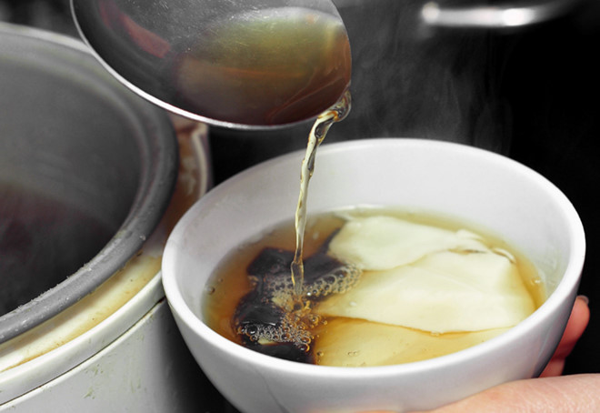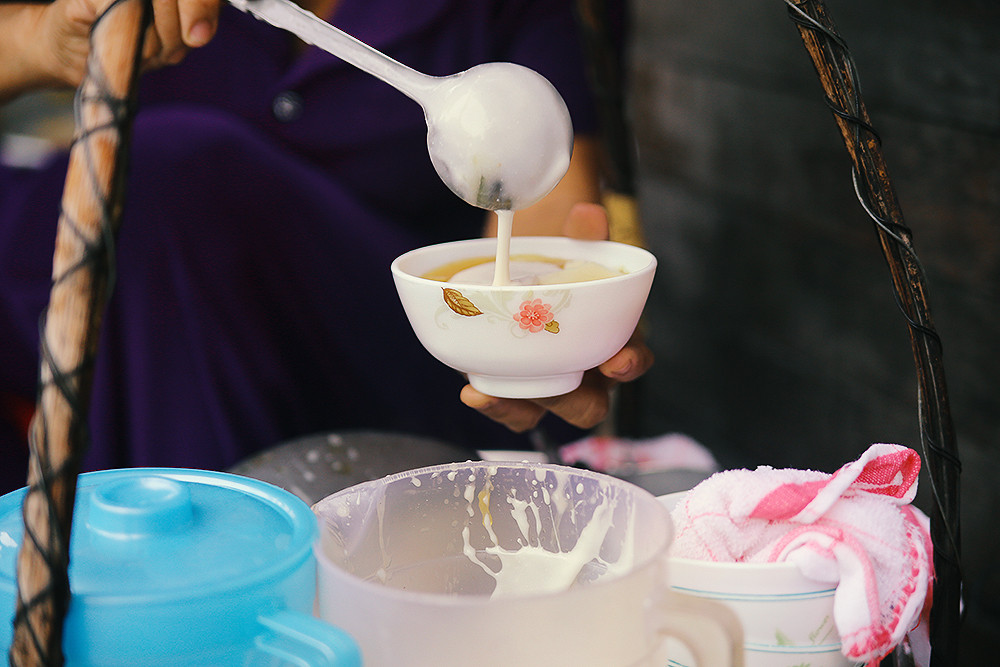 Khi khách tới ăn, chủ quán dùng dụng cụ đặc biệt bằng nhôm thật mỏng được đặt làm riêng, hớt từng lớp mỏng đậu hũ thả vào bát, rồi chan nước đường gừng, viên bột năng vào. Có người thích cho thêm cả nước cốt dừa, nhưng nhiều người chỉ thích tàu hũ với nước đường đúng kiểu xưa.