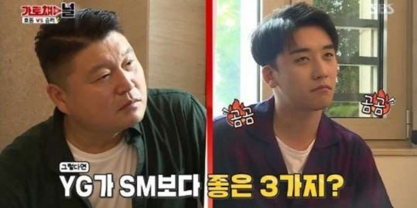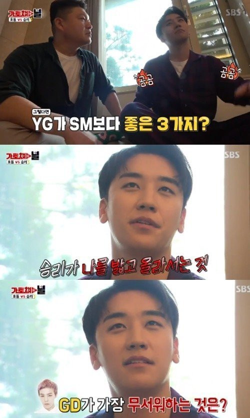 Seungri là nghệ sĩ của YG Ent, còn MC Kang Ho Dong lại là người của công ty SM C & C, một chi nhánh của SM Ent. Và cả hai đã ra sức nếu ra điểm mạnh của công ty mình. MC Kang Ho Dong có đề nghị Seungri kể ra ba ưu điểm vượt trội của YG Ent so với SM Ent.