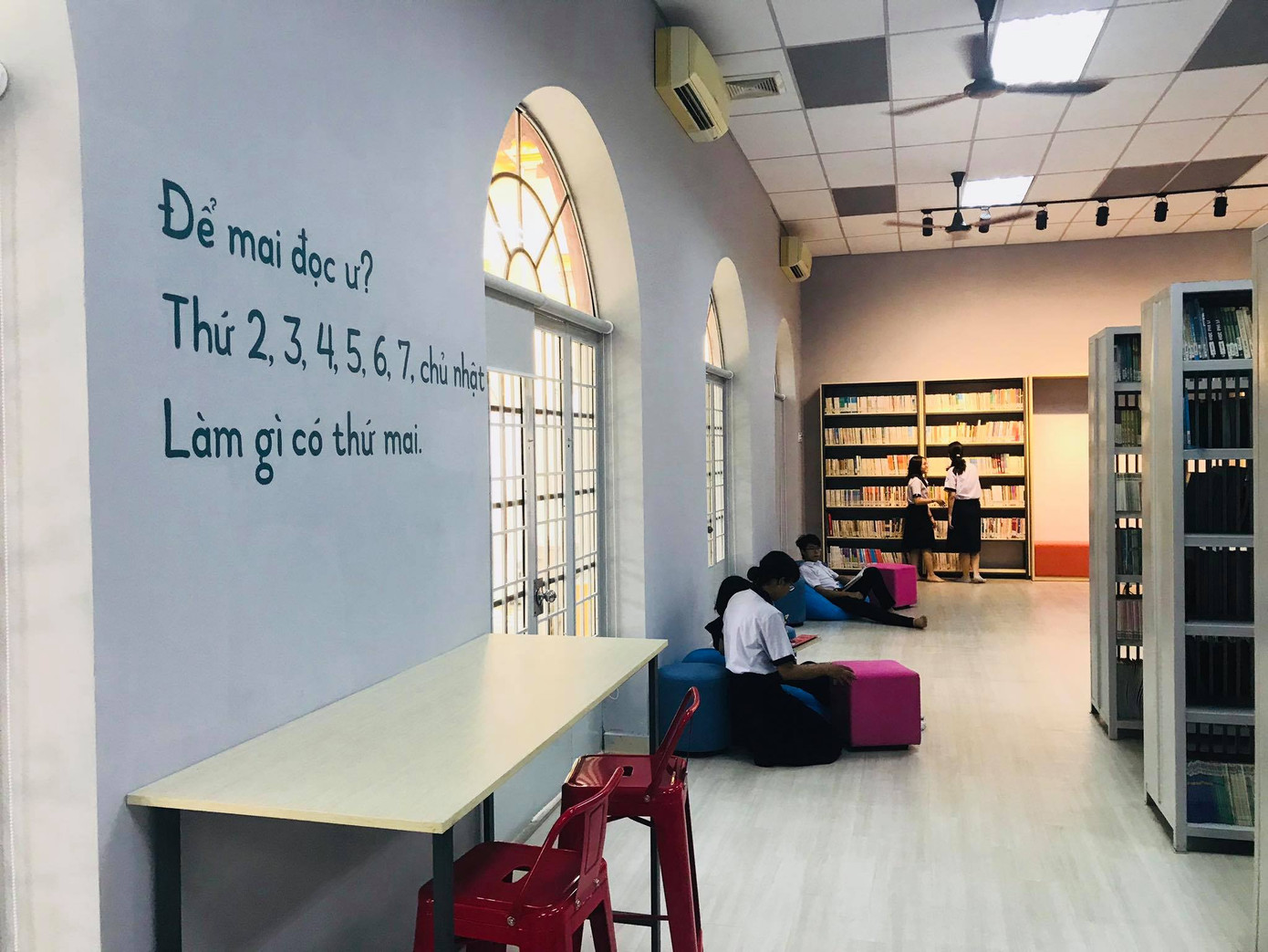 Nội thất thư viện có tông trắng - xám tối giản, giúp các bạn tập trung và thư giãn khi ngồi đọc sách trong thư viện. Những câu nói vui được ghi trên tường thư viện chính là điểm nhấn hết sức đáng yêu.