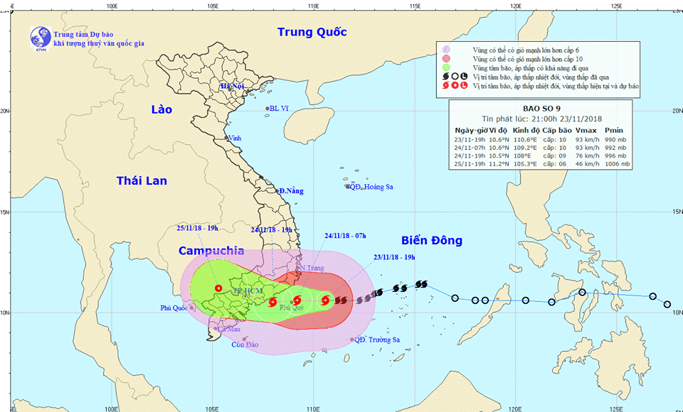 Khoảng chiều và tối ngày 24/11, bão sẽ ảnh hưởng trực tiếp đến đất liền Nam Trung Bộ - Nam Bộ (Ninh Thuận - Trà Vinh).