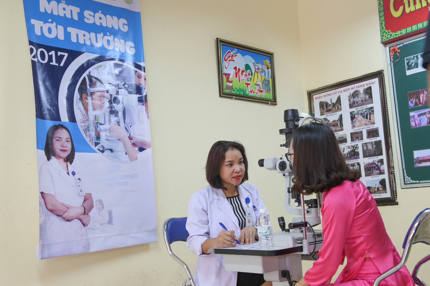 Các bạn học sinh và các thầy cô giáo được các bác sĩ tại Bệnh viện mắt quốc tế DND thăm khám và tư vấn miễn phí.