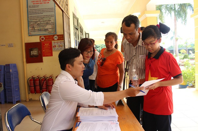 Các bạn học sinh lần lượt đăng ký khám.