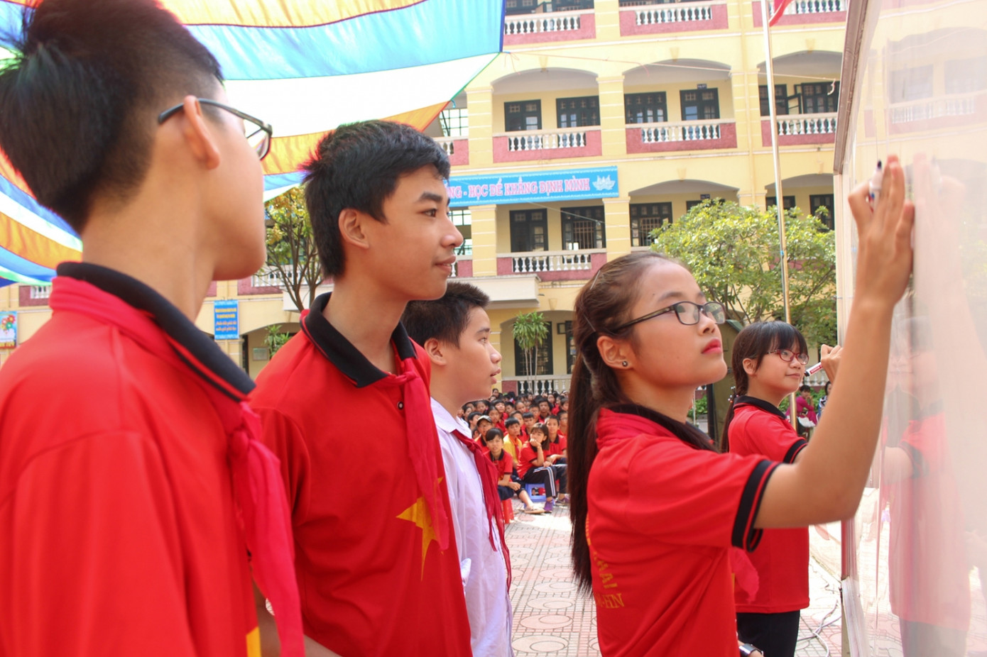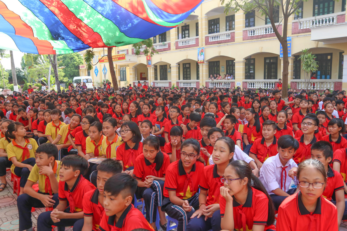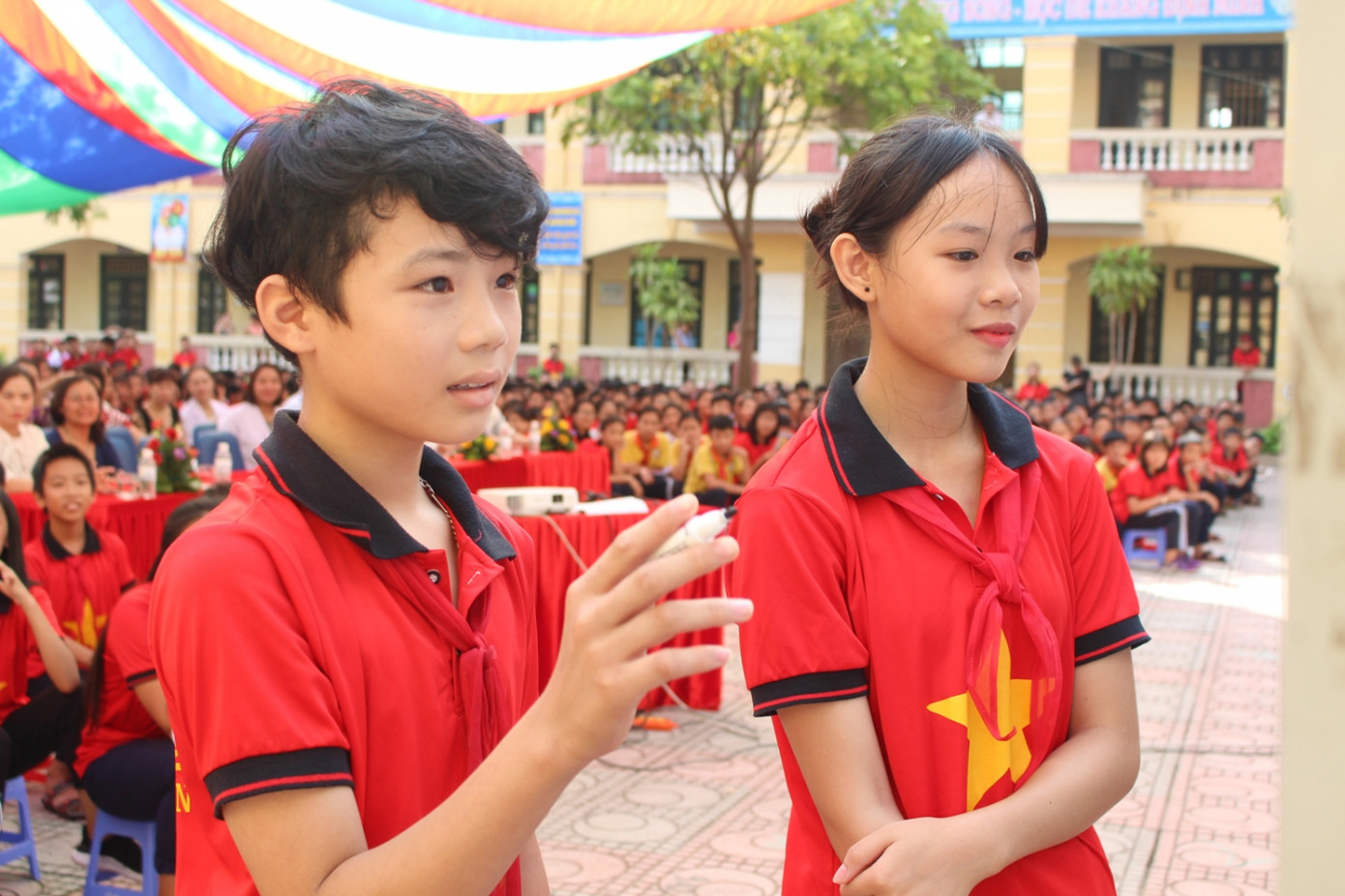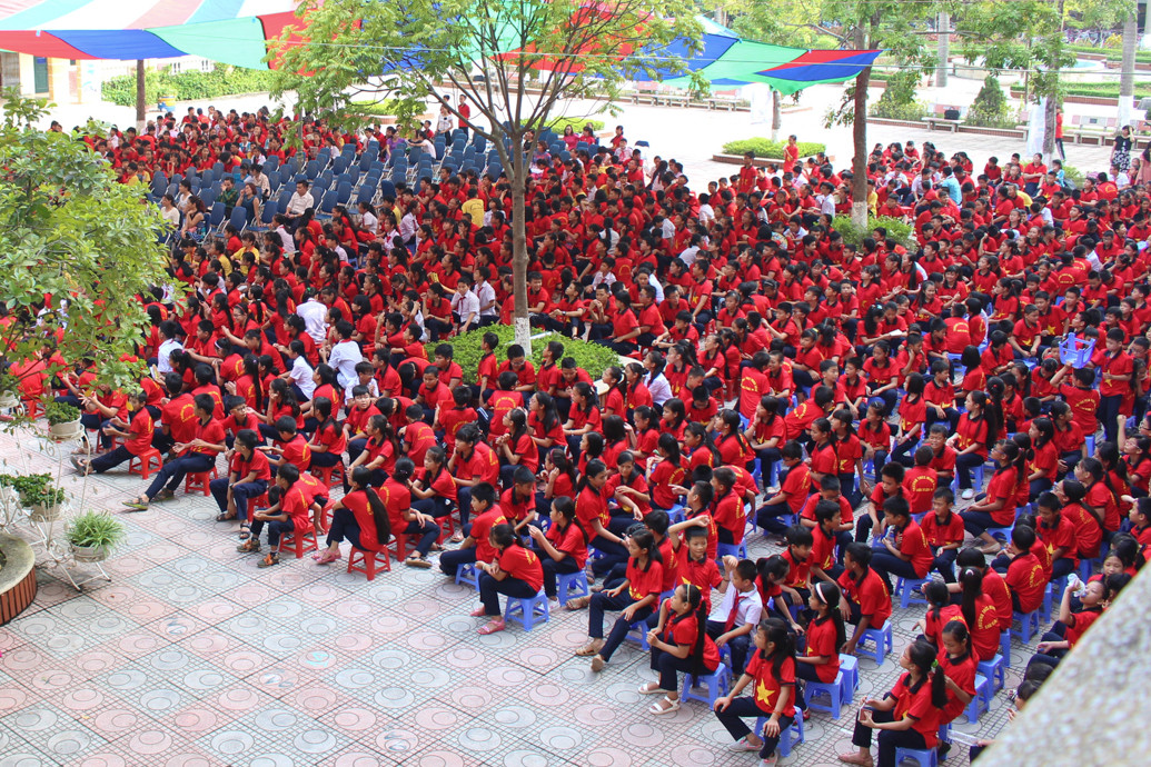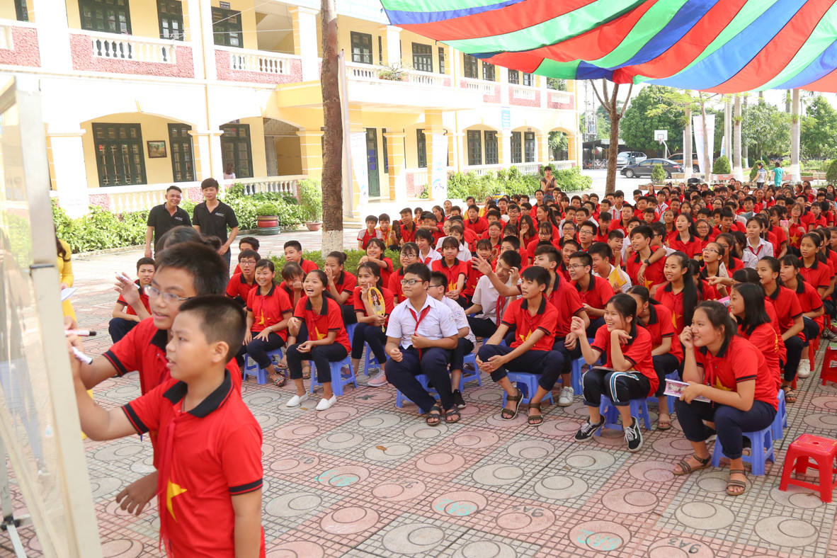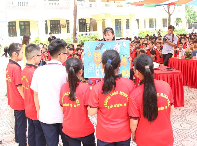 Các bạn học sinh trường THCS Minh Khai hào hứngtheo dõi các tiết mục văn nghệ và phần giao lưu.