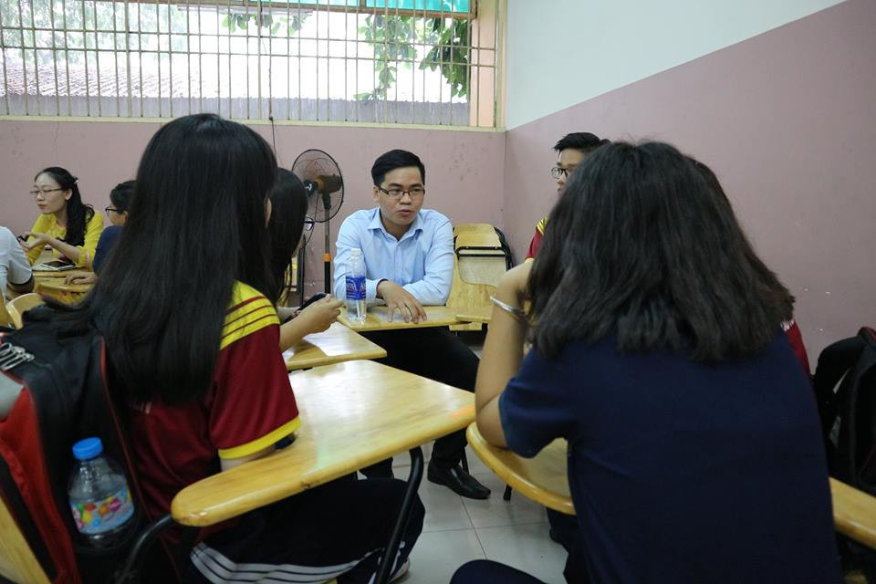 Các diễn giả trở thành “tư vấn viên” tại bàn trong phần hai của sự kiện. Những bạn có nhu cầu quan tâm về ngành nghề nào sẽ đến khu vực đó của diễn giả và được tư vấn trực tiếp. Nhóm ngành mang tên khá đặc biệt “Dịch vụ mến khách” của diễn giả Huỳnh Khánh Linh, sinh viên năm 1 đạt học bổng bán phần trường ĐH ERC thu hút nhiều sự tò mò của các bạn.