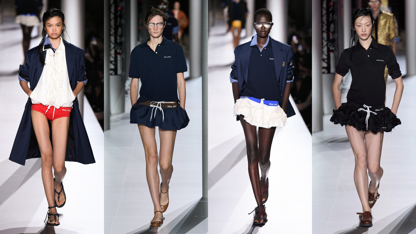 Ở bộ sưu tập của Miu Miu, nhà mốt Ý tập trung khai thác vào các chi tiết tinh tế lấy từ trang phục thể thao cổ điển, cùng các thiết kế mang cảm hứng nghĩ dưỡng bên hồ bơi của giới thượng lưu.