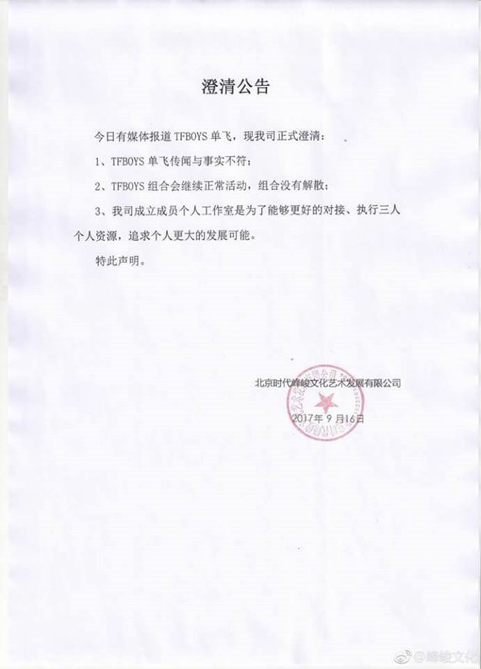 Thấy tình hình “bất ổn” và có nguy cơ “lửa cháy đến chân”, trang Weibo chính thức của Thời đại Phong Tuấn đã đăng tải thông tin với nội dung việc tan rã chỉ là suy diễn của cánh báo chí, đồng thời trấn an các fan của TFBOYS.