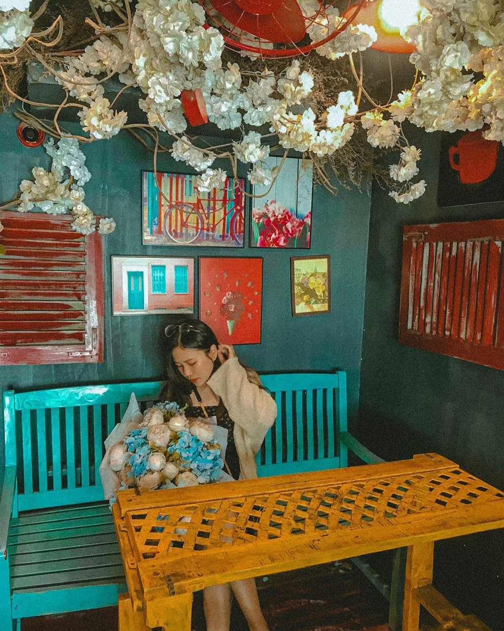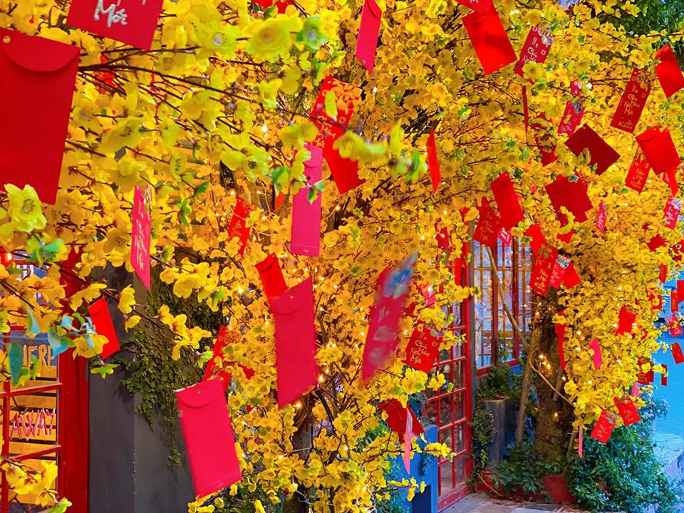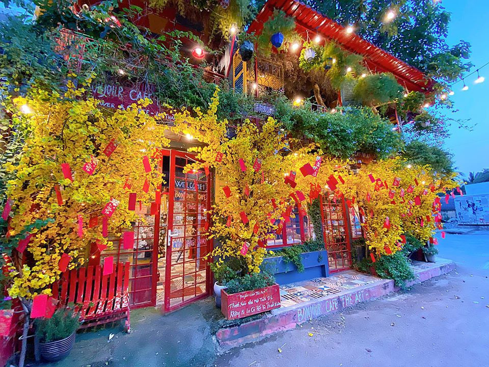 Bonjour Cafe The Art: Quán cà phê được trang trí không gian Tết lãng mạn, xung quanh bao phủ hoa mai vàng rực rỡ. Quán thu hút đông đảo du khách đến bởi màu đỏ nổi bật cùng thiết kế nghệ thuật với những khung cửa, chậu hoa nhỏ xinh và ban công.