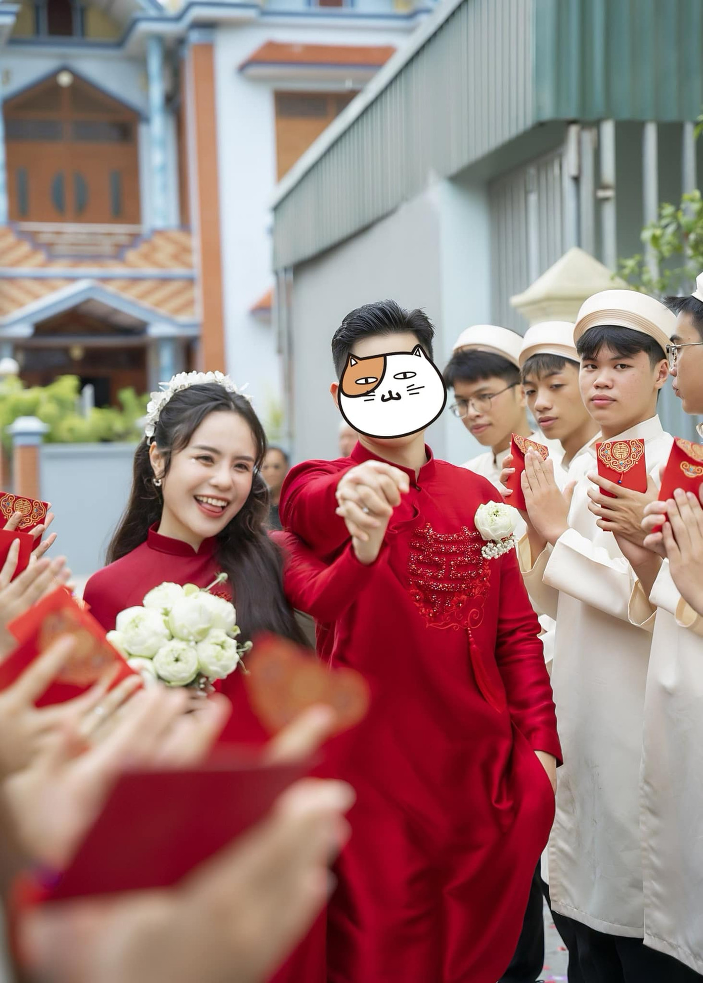 Trong ngày làm lễ gia tiên, Thái Trinh và chồng cùng diện bộ áo dài đỏ truyền thống. Khung cảnh trang hoàng đơn giản theo tông màu trắng, chỉ sử dụng hoa sen trắng để tô sắc thêm.
