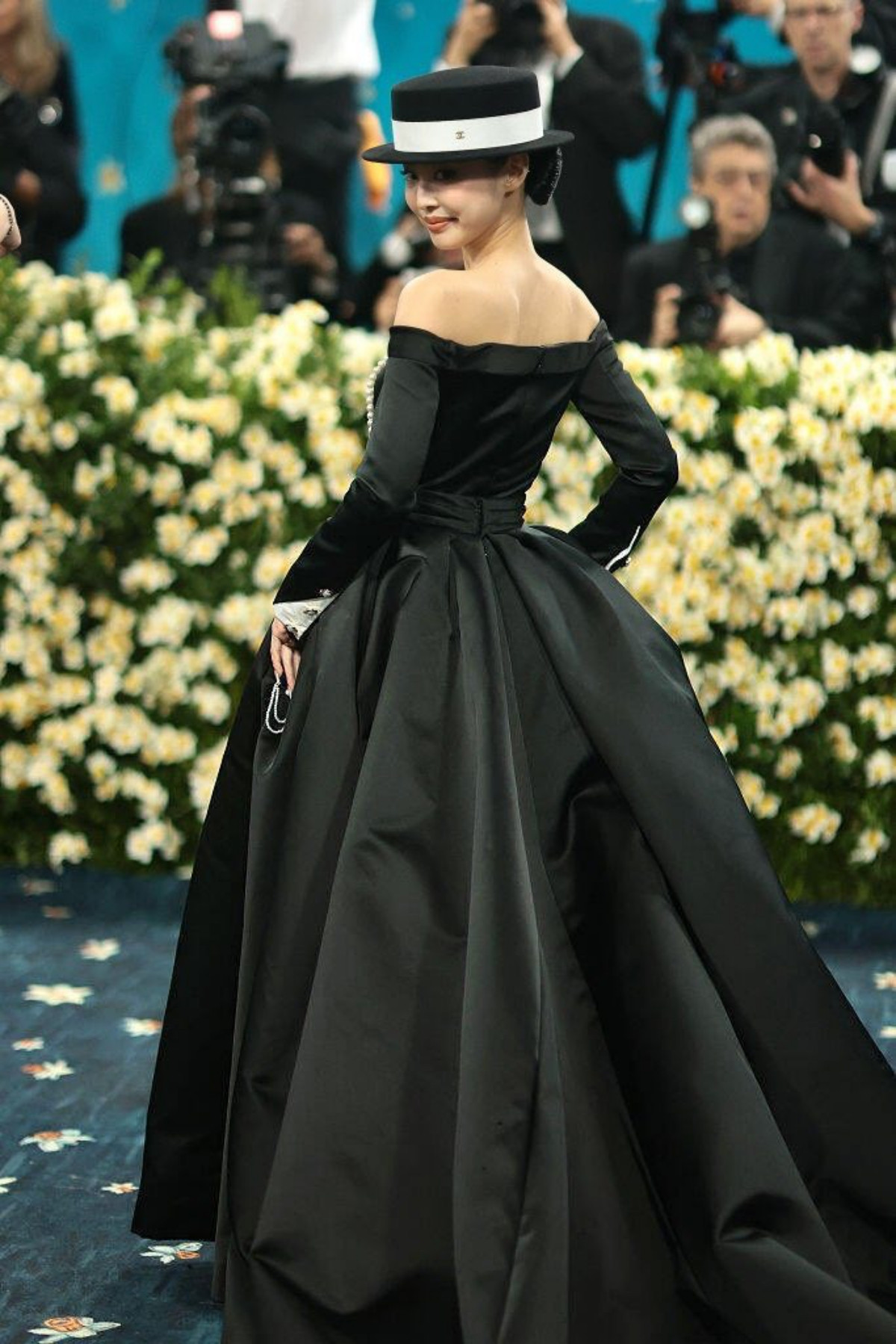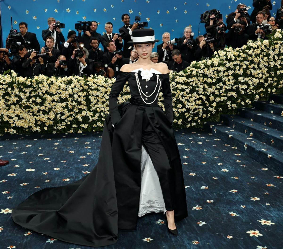 Jennie BLACKPINK diện mẫu đầm tuxedo được may đo riêng của thương hiệu Chanel, tô điểm với chi tiết hoa trà camellia, ngọc trai. Trang phục lấy cảm hứng từ thiết kế thuộc BST Thu Đông 1987 của NTK Karl Lagerfeld, tốn hơn 330 giờ chế tác.