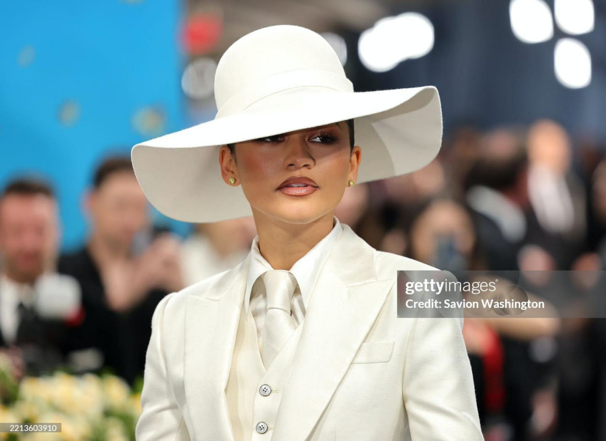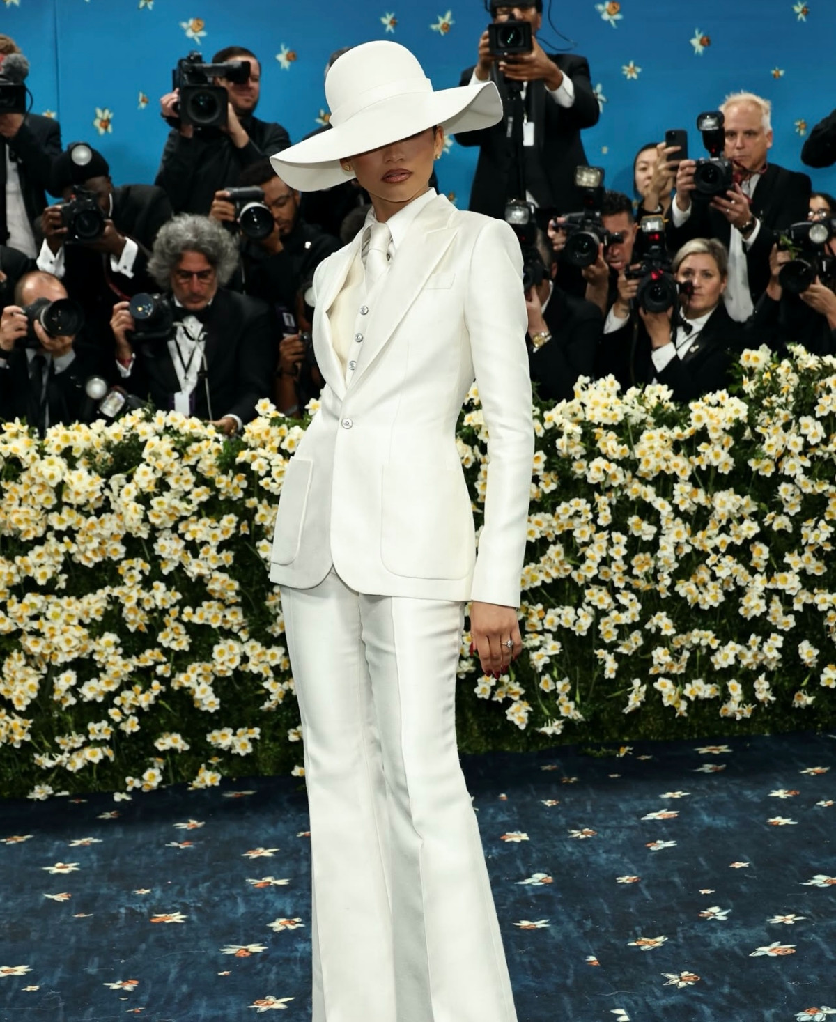 Zendaya siêu thần thái, đúng chủ đề trong bộ suit trắng cổ điển của Louis Vuitton, mũ rộng vành ton sur ton, được lấy cảm hứng từ Bianca Jagger và Diana Ross.