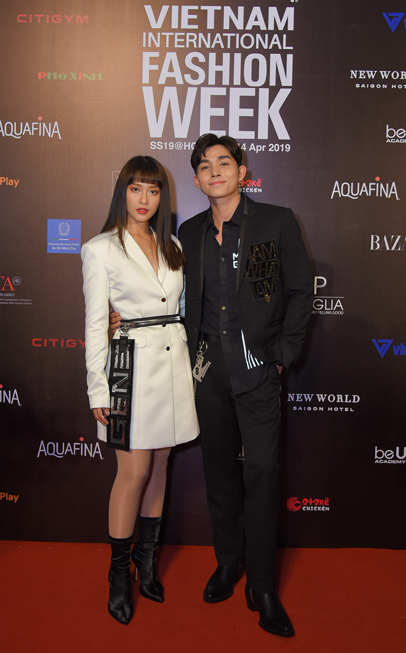 Sánh đôi trên thảm đỏ, Khả Ngân và Jun Phạm đồng bộ với blazer nhị sắc trắng đen. Cả hai đều chọn trang phục của NTK Chung Thanh Phong.