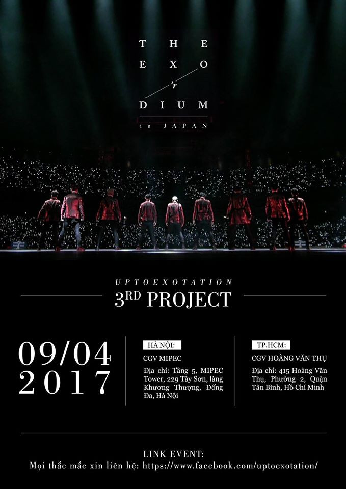 Trong ngày 9/4/2017, FC UptoEXOtation sẽ tổ chức hai buổi chiếu concert EXOPlanet #3 – The EXO’rDIUM in Japan vào lúc 13h tại hai địa điểm là rạp CGV Mipec (Hà Nội) và CGV Hoàng Văn Thụ (Q.2, TP.HCM) với giá vé 160K/ vé kèm set quà hấp dẫn.