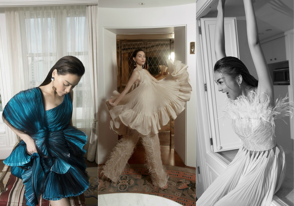 Thanh Hằng trong một mẫu mini-dress có hoạ tiết cánh hoa Geranium thêu nổi.