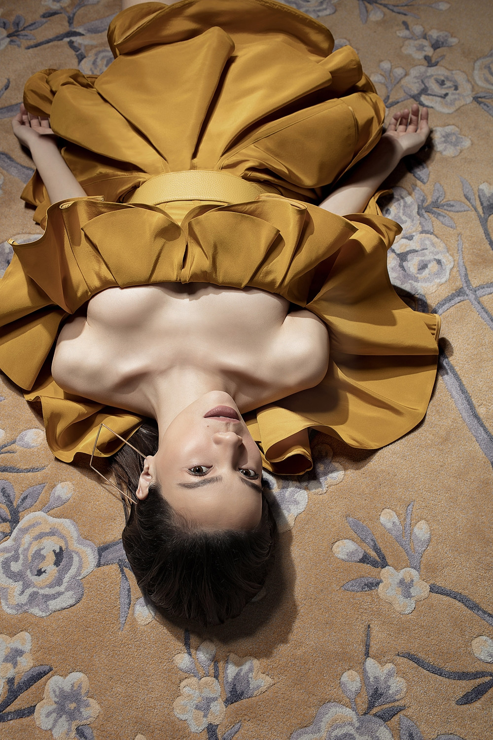 Hồ Ngọc Hà trong một mẫu đầm có phom dáng lấy cảm hứng từ hoa Yellow Rose.