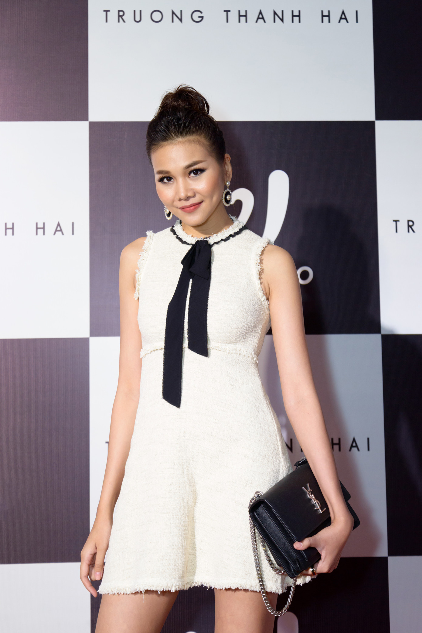 Với vóc dáng của một siêu mẫu, Thanh Hằng vẫn nữ tính với mẫu đầm ngắn kín đáo, chiếc nơ đen giúp tăng thêm sự dịu dàng cho cô.