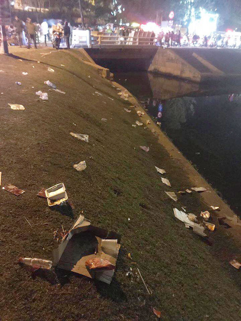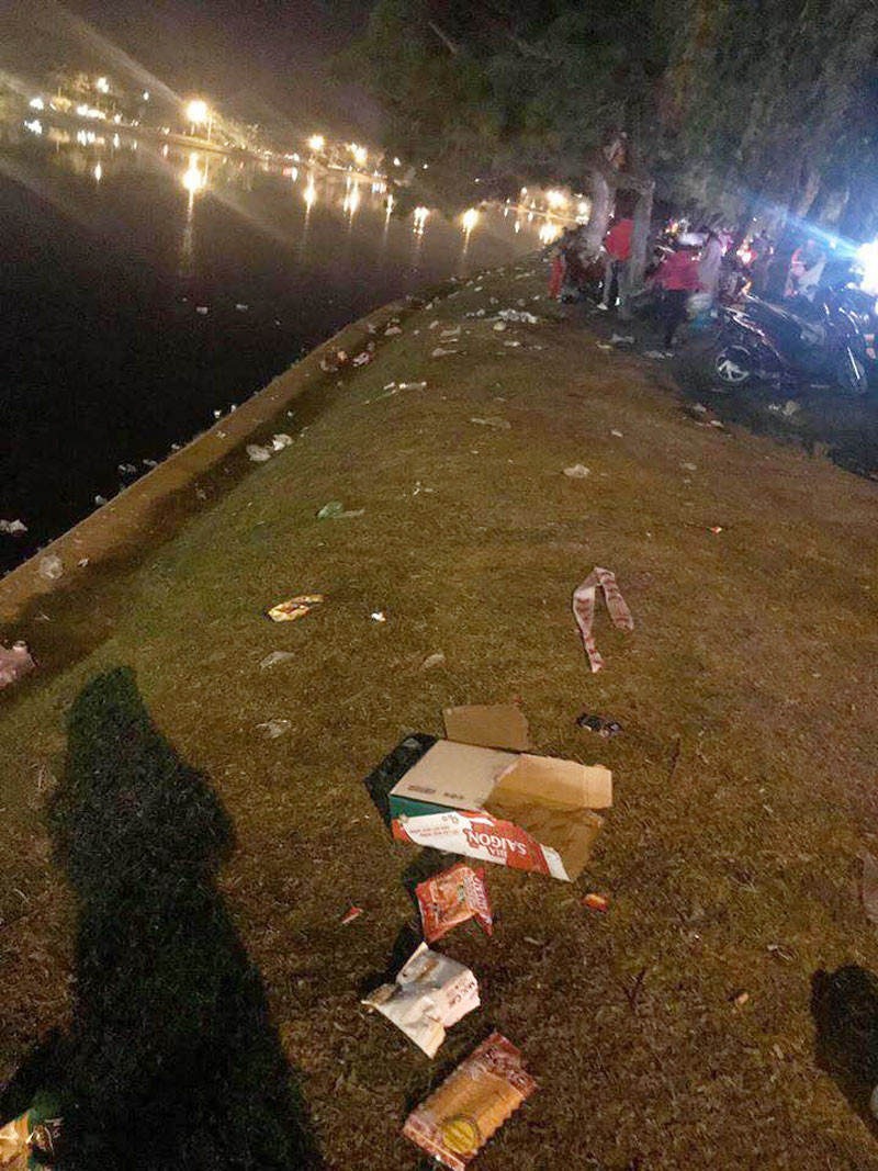Không chỉ khu vực quảng trường, những vị trí gần bờ hồ cũng ngập trong nhiều loại rác thải: từ túi bóng, vỏ lon bia, ly nhựa đến hộp xốp.