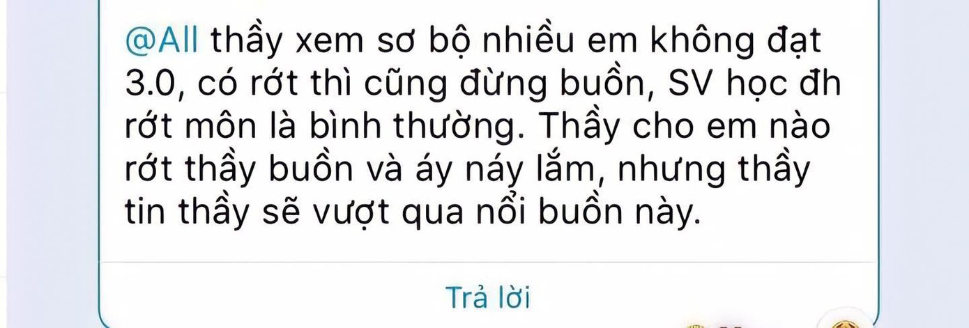 Cụ thể, thầy giáo này nhắn tin cho sinh viên của mình với nội dung: "Thầy xem sơ bộ nhiều em không đạt 3.0, có rớt thì cũng đừng buồn, sinh viên học Đại học rớt môn là chuyện bình thường. Thầy cho em nào rớt thầy buồn và áy náy lắm, nhưng thầy tin thầy sẽ vượt qua nỗi buồn này".