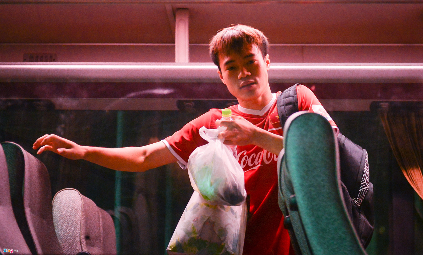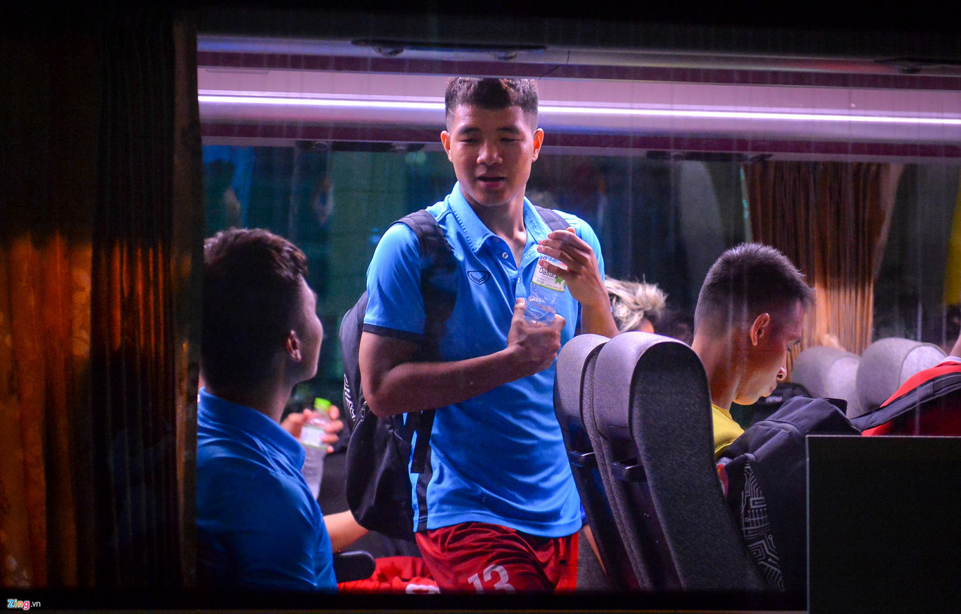 Trong khi các cầu thủ đều ngồi xuống và làm việc riêng, Hà Đức Chinh đứng trên xe và nói chuyện vui vẻ cùng Quang Hải. Sáng mai, đội tuyển Việt Nam sẽ lên đường sang Philippines dự trận bán kết lượt đi AFF Cup 2018.