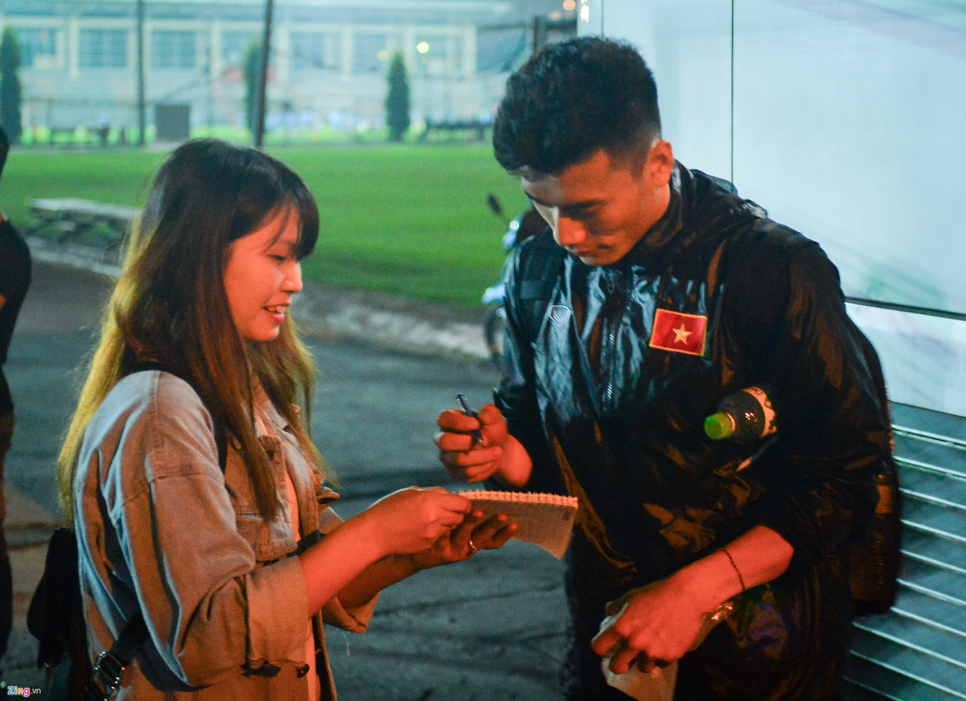 Thủ thành Bùi Tiến Dũng, tiền đạo Tiến Linh nán lại ký tặng người hâm mộ.