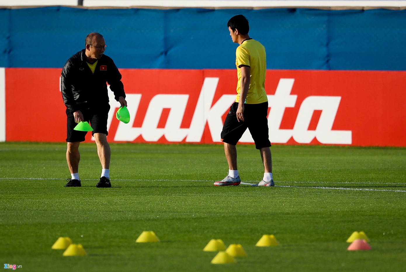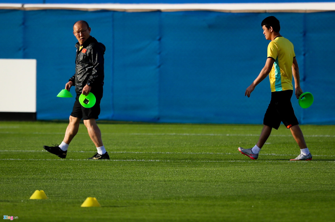 Trong khi các học trò khởi động, HLV Park Hang-seo lặng lẽ đi quanh sân xếp đồ tập cho học trò.