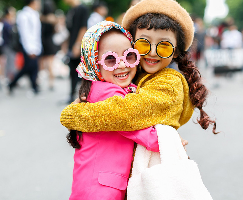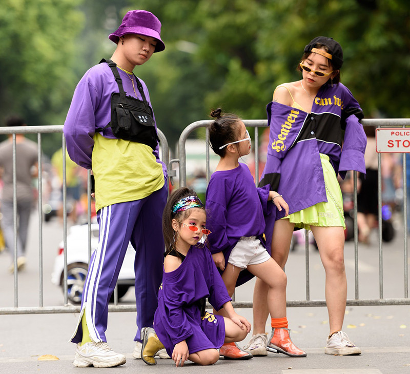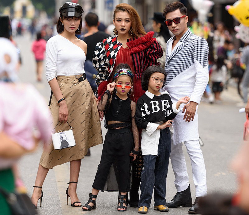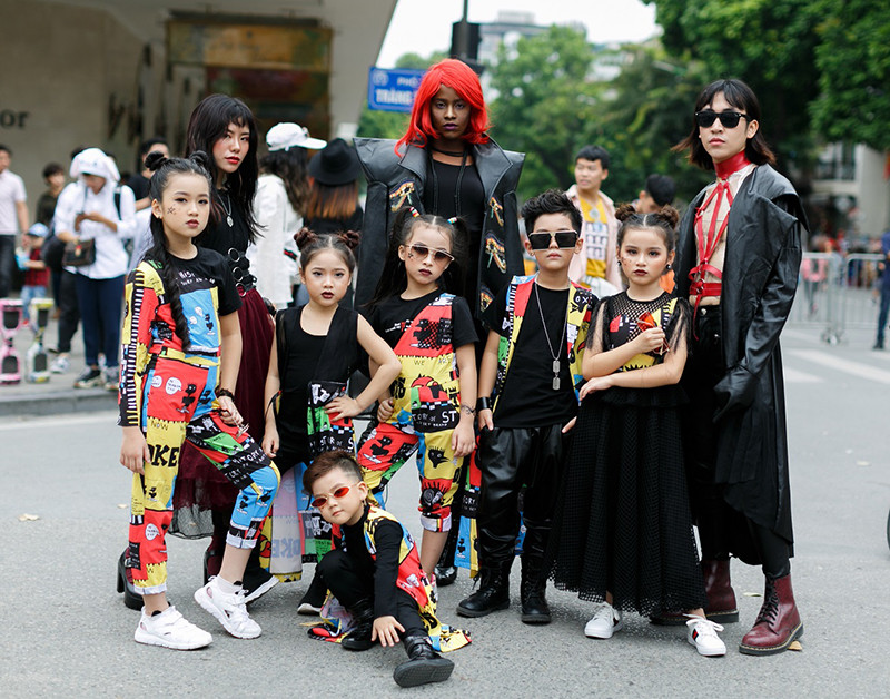 Một nhóm các bạn trẻ đi cùng em bé chọn trang phục đồng điệu màu đen, với điểm nhấn là những mảng màu, họa tiết theo phong cách pop-art nổi bật.