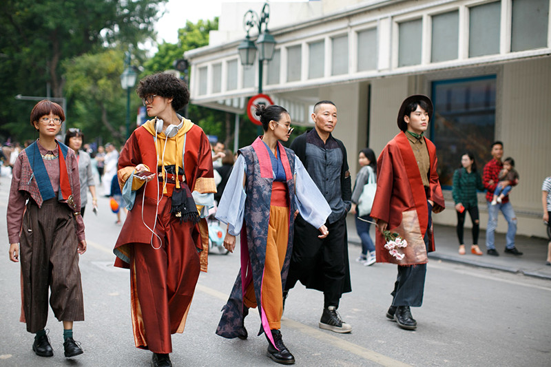 Sau màn “công phá” sàn diễn VIFW tối hôm trước, các thiết kế cổ xưa độc đáo trong bộ sưu tập Năm tháng vàng son của nhà thiết kế Hà Thu tiếp tục “càn quét” thời trang đường phố. Một nhóm bạn trẻ chọn diện các thiết kế dạo bước quanh các con phố cổ kính của Hà Nội.