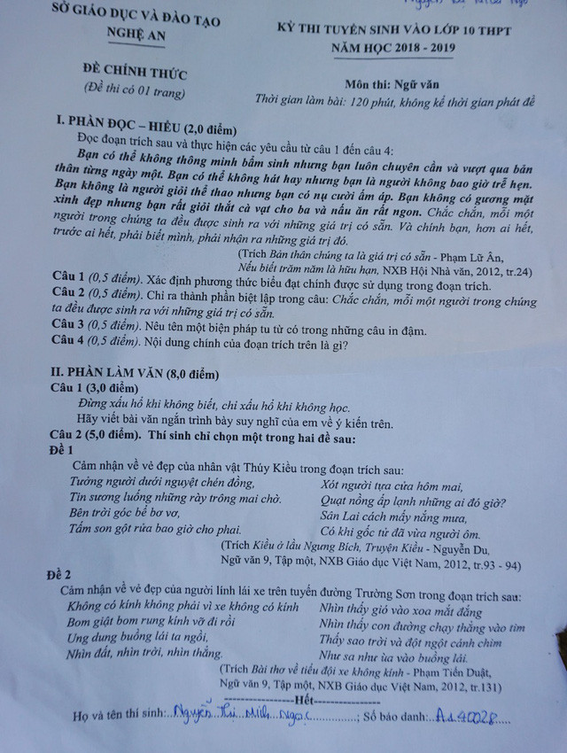 Đề thi môn Ngữ văn kỳ thi tuyển sinh lớp 10 năm học 2018 - 2019 tại Nghệ An.