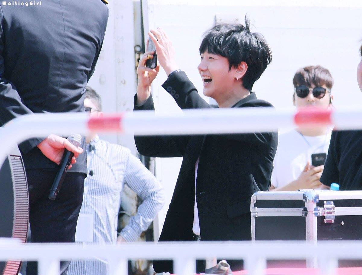 Yesung liên tục giơ điện thoại chụp ảnh Siwon ở khoảng cách gần làm cậu em Siwon phải cười ngượng ngùng như thế này đây.