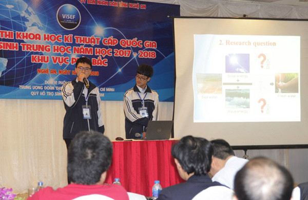 Chiều ngày 2/5, thầy Mai Văn Quyền - giáo viên Trường THPT chuyên Phan Bội Châu (Nghệ An) cho biết, Mai Nhật Anh và Phùng Văn Long (lớp 12A3), đồng tác giả dự án "Hệ thống chưng cất nước mặn thành nước ngọt với kỹ thuật chân không bằng bơm thủy lực bởi năng lượng sóng biển” và các quan sát viên của đoàn Nghệ An vừa hoàn tất cuộc phỏng vấn cấp visa sang Mỹ dự thi Khoa học kỹ thuật (KHKT) quốc tế.