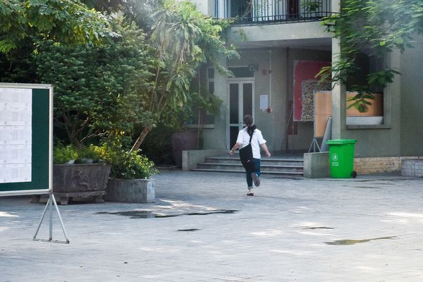 Tại điểm thi THPT Lương Thế Vinh (Hà Nội), nhiều thí sinh đến điểm thi trễ, hớt hải chạy vào phòng thi khi chỉ còn ít phút nữa là phát đề.