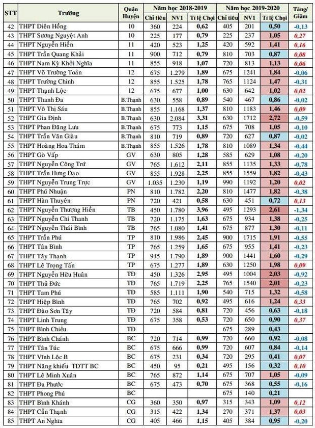Cụ thể, nhiều trường ở huyện Hóc Môn có tỷ lệ "chọi" cao như THPT Nguyễn Hữu Tiến 2,26; THPT Bà Điểm 2,24; THPT Lý Thường Kiệt 2,12; THPT Phạm Văn Sáng 2,10. Bên cạnh đó, một số trường ở khu vực Thủ Đức cũng cao như THPT Nguyễn Hữu Huân 2,03; THPT Thủ Đức 2,01.
