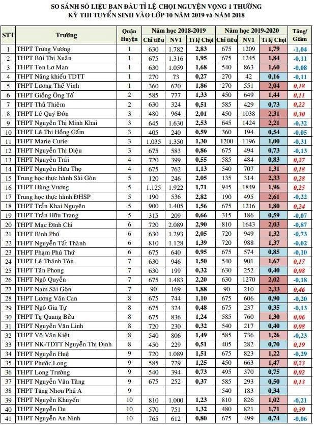 Những trường thuộc top đầu khác của thành phố đều có số thí sinh đăng ký nguyện vọng một cao như THPT Mạc Đĩnh Chi, THPT Bùi Thị Xuân, THPT Phú Nhuận, THPT Nguyễn Thượng Hiền, THPT Nguyễn Thị Minh Khai, THPT Trưng Vương.