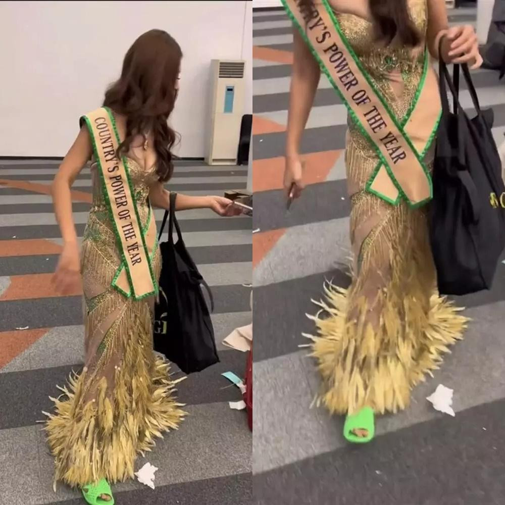 Mới đây, một video ghi lại cảnh Thiên Ân rời khỏi sân khấu Chung kết Miss Grand International 2022 đã khiến cư dân mạng bật cười. Nàng hậu diện nguyên trang phục dạ hội cầu kỳ lấp lánh nhưng dưới chân lại xỏ đôi dép tổ ong nổi bần bật. Chắc hẳn Thiên Ân đã tạm giã từ đôi giày cao gót để đôi chân được nghỉ ngơi, còn nhiều khán giả nói vui rằng đôi dép rất hợp màu với các chi tiết trang trí trên bộ váy.