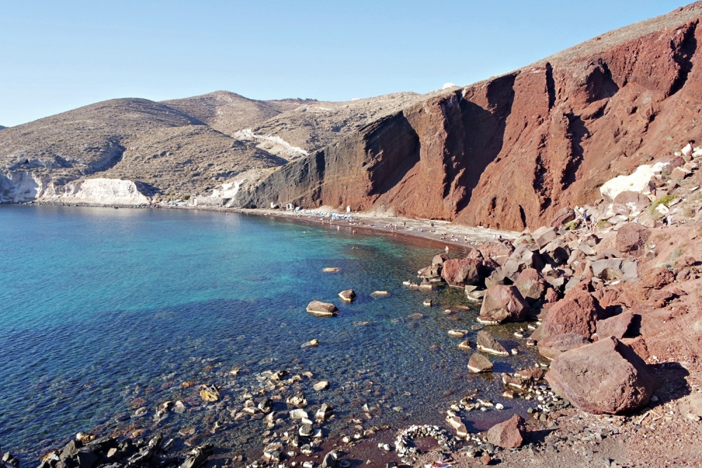 Santorini còn sở hữu những bãi biển rất đặc biệt vì hòn đảo là tàn dư của một miệng núi lửa vì thế ở đây có suối nước nóng, bãi biển với màu sắc khác lạ vì ảnh hưởng của bụi núi nửa. Sắc biển tai đây cũng thay đổi theo bức xạ Mặt Trời trong ngày, lúc thì xanh biêng biếc, khi lấp lánh ánh sáng bạc, lúc lại rực màu cam nhuộm bởi hoàng hôn.