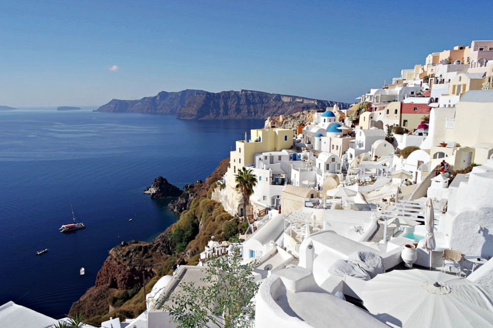 Những căn nhà xếp lớp cao dần theo hình bậc thang, chênh vênh bên sườn núi tạo nên vẻ đẹp đặc trưng cho Santorini. Đặt chân đến hòn đảo này, du khách sẽ có cảm giác như lạc vào cõi thiên đường, bởi tất cả công trình ở đây đều được sơn trắng - từ nhà thờ, nhà ở đến các khách sạn. Ngoài ra, các công trình ở Santorini đều đồng nhất theo kiến trúc mái vòm và cửa sổ đối xứng, tạo nên tổng thể hài hòa và đặc trưng.