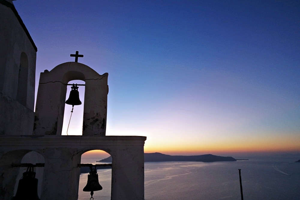 Tại hòn đảo Santorini xinh đẹp, bạn có thể ngắm hoàng hôn ở bất kỳ vị trí nào, trên những bậc thềm, boong tàu hay nơi những chiếc thuyền neo đậu xung quanh miệng núi lửa. Chính vì lẽ đó, nơi đây được các tạp chí du lịch nổi tiếng bình chọn là điểm du lịch lãng mạn nhất để tổ chức đám cưới và tuần trăng mật.