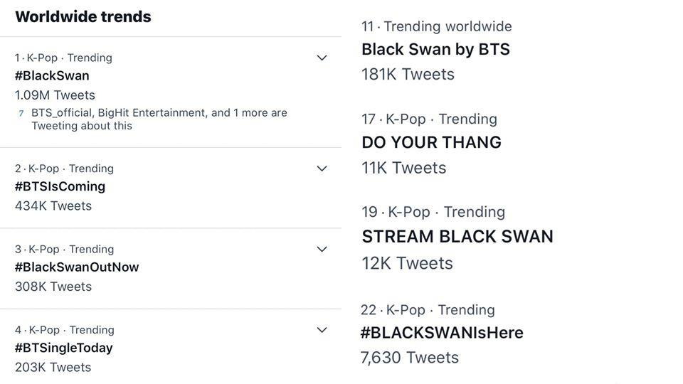 Tuy Black Swan chỉ là promo single, không được quản bá rầm rộ nhưng “Thiên nga đen” vẫn làm nên những thành tích vô cùng ấn tượng. Các hashtag và từ khoá lần lượt chiếm đóng top trending toàn thế giới sau khi single đầu tiên trong album Map Of the Soul: 7 - Black Swan được ra mắt.