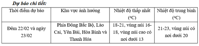 Từ ngày 23/2, ở khu vực phía Đông Bắc Bộ, Lào Cai, Yên Bái, Hòa Bình và Thanh Hóa trời chuyển lạnh, vùng núi có nơi rét trời rét. Trong đợt không khí lạnh này nhiệt độ thấp nhất ở những khu vực trên phổ biến từ 17-20 độ C, khu vực vùng núi Bắc Bộ từ 15-17 độ C, vùng núi cao có nơi dưới 12 độ C.