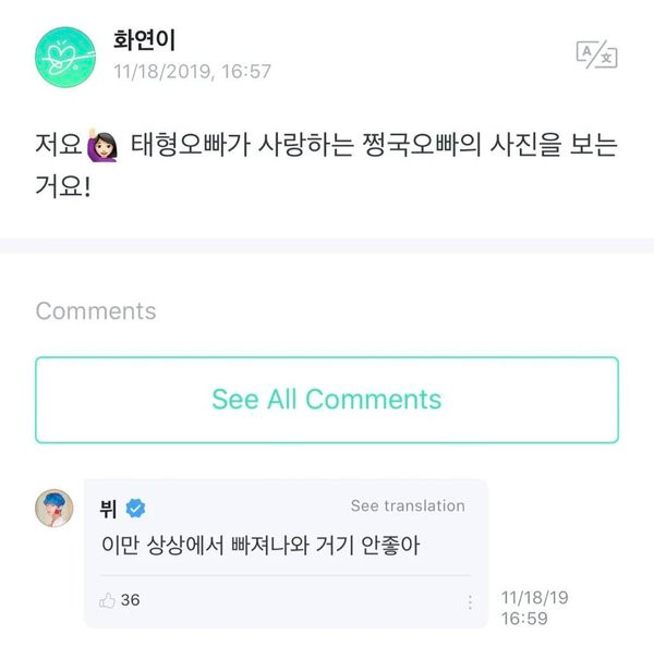 Nhưng mới đây, V đã thẳng thắn bày tỏ cảm xúc của mình khi thấy fan ghép đôi mình với Jungkook. Chẳng là trong ứng dụng Weverse để idol nhà Big Hit nói chuyện với fan, V có hỏi mọi người xem có biết cách nào để ngủ được thật nhanh hay không. Dường như V đang mắc chứng khó ngủ, và một khán giả đã gợi ý V rằng “Em nghĩ anh cứ ngắm ảnh của Jungkook, người mà anh yêu ấy”. Đọc xong, V đã trả lời ngay rằng “Hãy thoát ra khỏi câu chuyện tưởng tượng của em ngay nhé, ở trong đó không tốt chút nào đâu”.