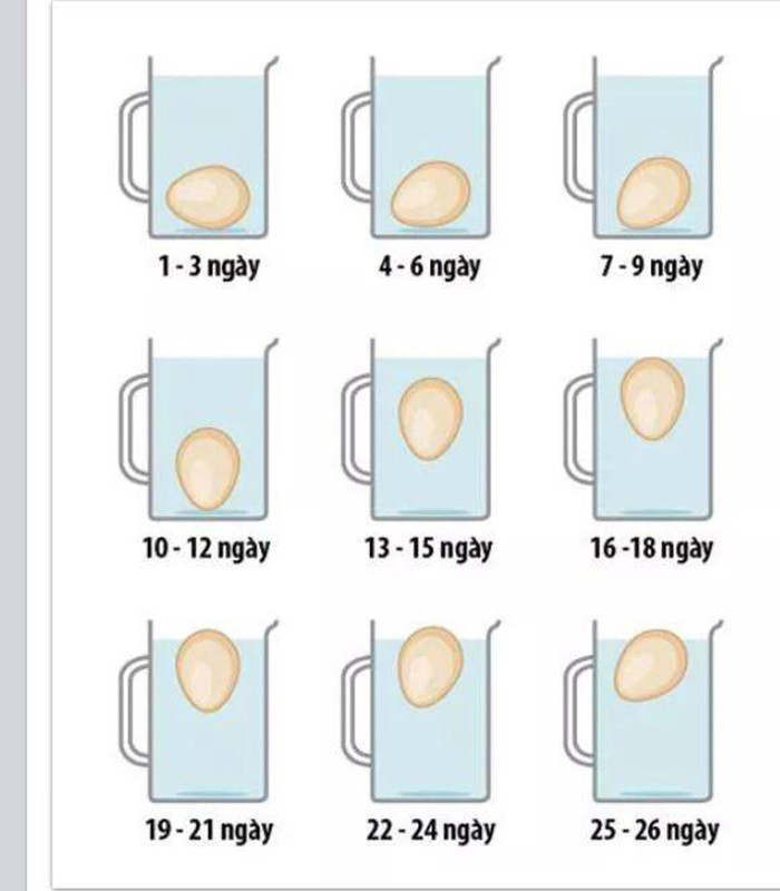 Ngoài việc đảm bảo thời gian luộc trứng, chúng ta cũng cần phân biệt được độ mới cũ của trứng để có thể đảm bảo hơn về chất lượng món ăn. Cách thực hiện rất đơn giản, bạn chỉ cần thả trứng vào một thau nước và để yên trong vài phút. Sau đó hãy so sánh theo bảng dưới đây để biết được đâu là trứng mới, đâu là trứng cũ. Lưu ý, những quả trứng nào nổi trên mặt nước là đã quá cũ, không ăn được nữa.